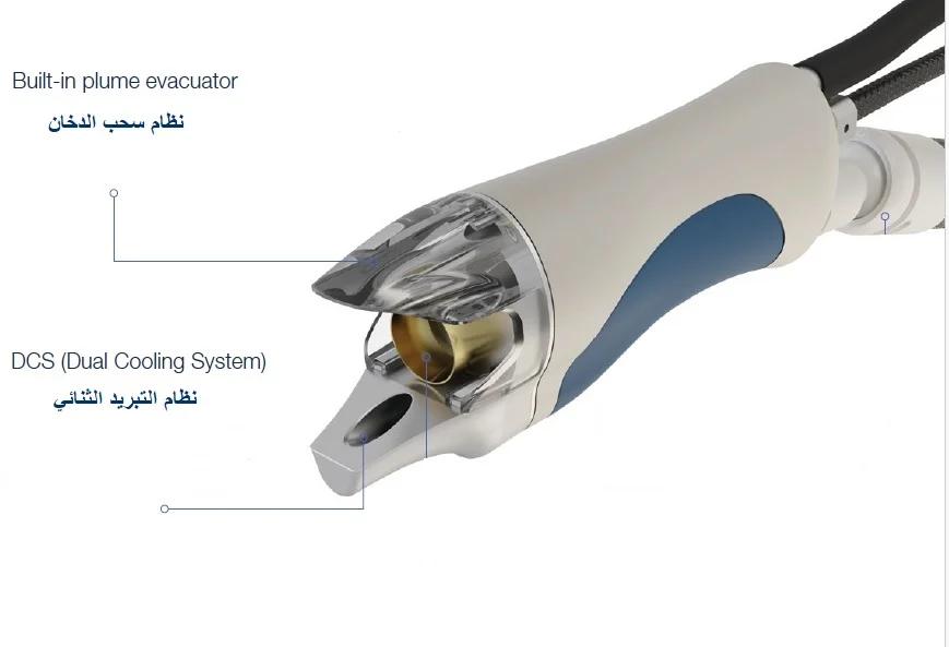 يوفر الجهاز تجربة علاج مريحة بفضل نظام التبريد المزدوج (DCS)، الذي يجمع بين الهواء البارد والتبريد المباشر على سطح الجلد.